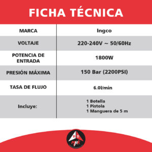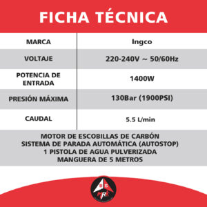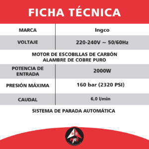HIDROLAVADORA INGCO DE ALTA PRESION 2000W 160Bar (2320PSI), HPWR20018