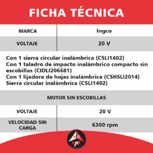 Kit INGCO combinado inalámbrico de 3 PCS CSLI1402, CIDLI206681,CSH SLI2014, COSLI241193