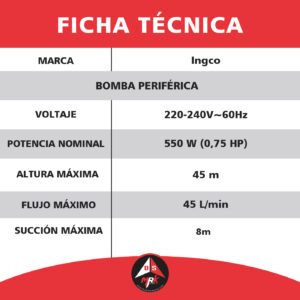 BOMBA DE AGUA PERIFERICA 0.5HP 35M 35L/ MIN 1X1, TOTAL TWP13706-5